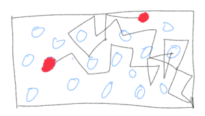 The first one is to pick a particle, any particle, since none of them are special, and follow (track) the particle for a long time; i.e measure its position at tiny time intervals, calculate its velocity from its location at two successive times, calculate the energy and find the average over time. This would amount to creating a time series for a particle. From this accompanying doodle it is not that outlandish to imagine that if we track this particle long enough, it will eventually visit all parts of the box somewhat “democratically”, with no particular preference for some locations. We can extend this to tracking more than just one particle and get even more accurate information. In essence, we are investigating the time evolution of a micro-state of the system and finding time-averages of micro-state variables like the velocity of the particle.